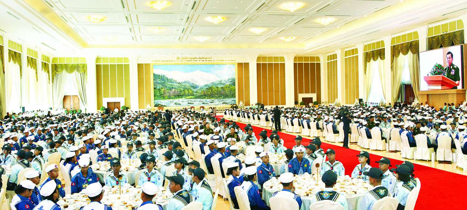 နိုင်ငံတော်စီမံအုပ်ချုပ်ရေးကောင်စီဥက္ကဋ္ဌ တပ်မတော်ကာကွယ်ရေးဦးစီးချုပ် ဗိုလ်ချုပ်မှူးကြီး မင်းအောင်လှိုင် အခြေခံနှင့်တန်းမြင့် ရေကြောင်းလူငယ် သင်တန်းအမှတ်စဉ် (၁/၂၀၂၅) နှင့် အခြေခံနှင့် တန်းမြင့်လေကြောင်းလူငယ်သင်တန်း (၁/၂၀၂၅) မှ သင်တန်းသား သင်တန်းသူများနှင့် အုပ်ချုပ်သူနည်းပြများအား တွေ့ဆုံအမှာစကားပြောကြား