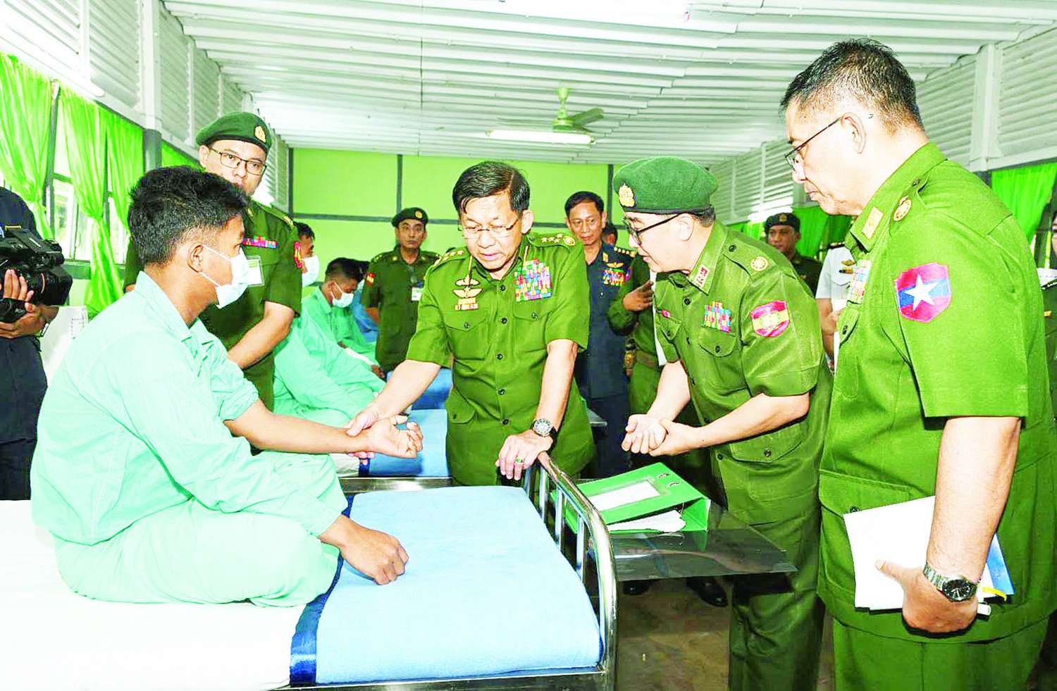 နိုင်ငံတော်စီမံအုပ်ချုပ်ရေးကောင်စီဥက္ကဋ္ဌ တပ်မတော်ကာကွယ်ရေးဦးစီးချုပ် ဗိုလ်ချုပ်မှူးကြီး မင်းအောင်လှိုင် မိတ္ထီလာမြို့ရှိ တပ်မတော်ဆေးရုံ၌ တက်ရောက်ကုသမှုခံယူလျက်ရှိသည့် အရာရှိ၊ စစ်သည်များ၏ ကျန်းမာရေးအခြေအနေများအား သွားရောက်ကြည့်ရှုအားပေးပြီး လိုအပ်သည်များ ဖြည့်ဆည်းဆောင်ရွက်