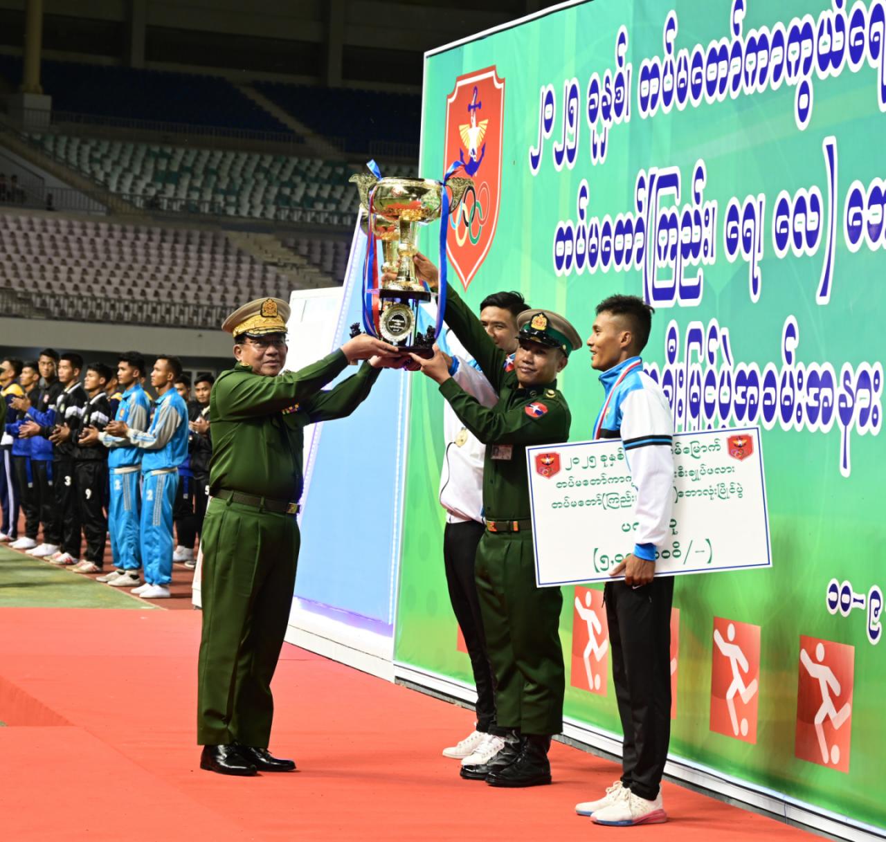 နိုင်ငံတော်လုံခြုံရေးနှင့်အေးချမ်းသာယာရေးကော်မရှင်ဥက္ကဋ္ဌ တပ်မတော်ကာကွယ်ရေးဦးစီးချုပ် ဗိုလ်ချုပ်မှူးကြီး မင်းအောင်လှိုင် ၂၀၂၅ ခုနှစ်၊ (၆၂) ကြိမ်မြောက် တပ်မတော်ကာကွယ်ရေးဦးစီးချုပ်ဖလား တပ်မတော် (ကြည်း၊ ရေ၊ လေ) ဘောလုံးပြိုင်ပွဲ ဗိုလ်လုပွဲနှင့်ဆုချီးမြှင့်ပွဲ အခမ်းအနားသို့တက်ရောက်၍ ဆုများပေးအပ်ချီးမြှင့်
