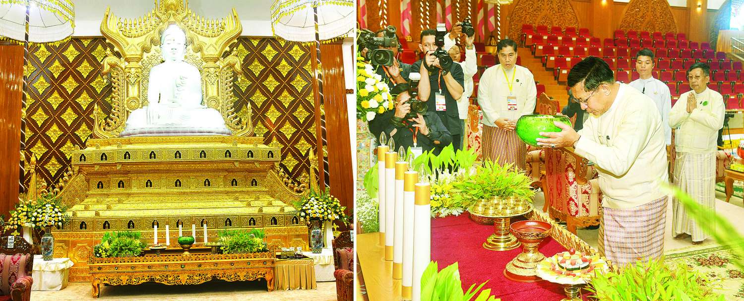 ဦးစွာ နိုင်ငံတော်ယာယီသမ္မတ နိုင်ငံတော်လုံခြုံရေးနှင့်အေးချမ်းသာယာရေးကော်မရှင်ဥက္ကဋ္ဌသည် အဂ္ဂါဓိပတိသာသနာ့ဗိမာန်တော်ကြီးအတွင်းရှိ မာရဝိဇယ နောင်တော်ကြီး ဗုဒ္ဓရုပ်ပွားတော်မြတ်အား ဖူးမြော်ကြည်ညို၍ မြသပိတ်ဆွမ်းတော်၊ ပန်း၊ ရေချမ်း၊ ဆီမီးနှင့် သစ်သီးတို့ကို ဆက်ကပ်လှူဒါန်းသည်။