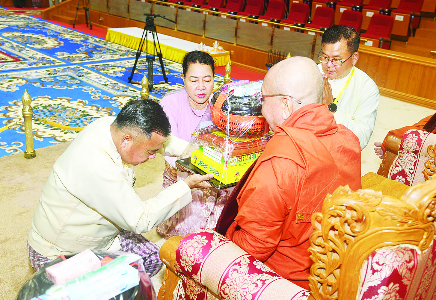 ပြည်ထောင်စုသမ္မတမြန်မာနိုင်ငံတော် အမျိုးသားကာကွယ်ရေးနှင့်လုံခြုံရေးကောင်စီ ၂၀၂၅ ခုနှစ် ကထိန်သင်္ကန်း ဆက်ကပ်လှူဒါန်းပွဲအခမ်းအနားကို ယနေ့နံနက်ပိုင်းတွင် ပြည်ထောင်စုနယ်မြေ နေပြည်တော် ဒက္ခိဏသီရိမြို့နယ် မာရဝိဇယဗုဒ္ဓဥယျာဉ်ဝတ္ထုကံတော်အတွင်းရှိ အဂ္ဂါဓိပတိသာသနာ့ဗိမာန်တော်ကြီး၌ ဆင်ယင်ကျင်းပရာ ပြည်ထောင်စုသမ္မတမြန်မာနိုင်ငံတော်ယာယီသမ္မတ နိုင်ငံတော်လုံခြုံရေးနှင့်အေးချမ်းသာယာရေးကော်မရှင်ဥက္ကဋ္ဌ ဗိုလ်ချုပ်မှူးကြီး မင်းအောင်လှိုင်နှင့်ဇနီး ဒေါ်ကြူကြူလှတို့ တက်ရောက်၍ ကထိန်လျာသင်္ကန်းနှင့် ကထိန်လှူဖွယ်ပစ္စည်းများ ဆက်ကပ်လှူဒါန်းသည်။
