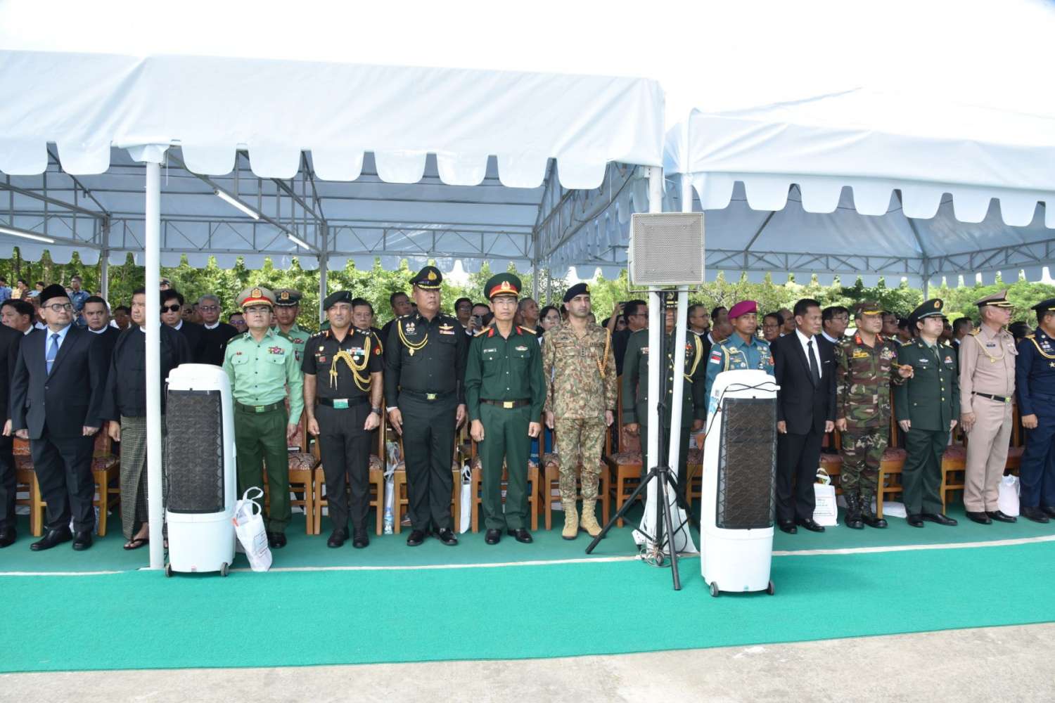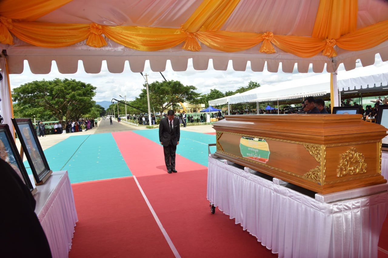ယင်းနောက် နိုင်ငံတော်လုံခြုံရေးနှင့် အေးချမ်းသာယာရေးကော်မရှင်ဥက္ကဋ္ဌ၊ ကော်မရှင်ဒုတိယဥက္ကဋ္ဌနှင့် ပြည်ထောင်စုအဆင့်ပုဂ္ဂိုလ်များ၊ ကာကွယ်ရေးဦးစီးချုပ်ရုံးမှ အဆင့်မြင့်တပ်မတော်အရာရှိကြီးများက နေရာယူကြပြီး တပ်မတော်ဂုဏ်ပြု သေနတ်ပစ်အဖွဲ့က ဂုဏ်ပြုစစ်ရေးပြအစီအစဉ်အတိုင်းဆောင်ရွက်ကာ သေနတ်မြေစိုက် ဦးခိုက်အလေးပြုကြပြီး သေနတ်မြှောက်အလေးပြုကြသည်။