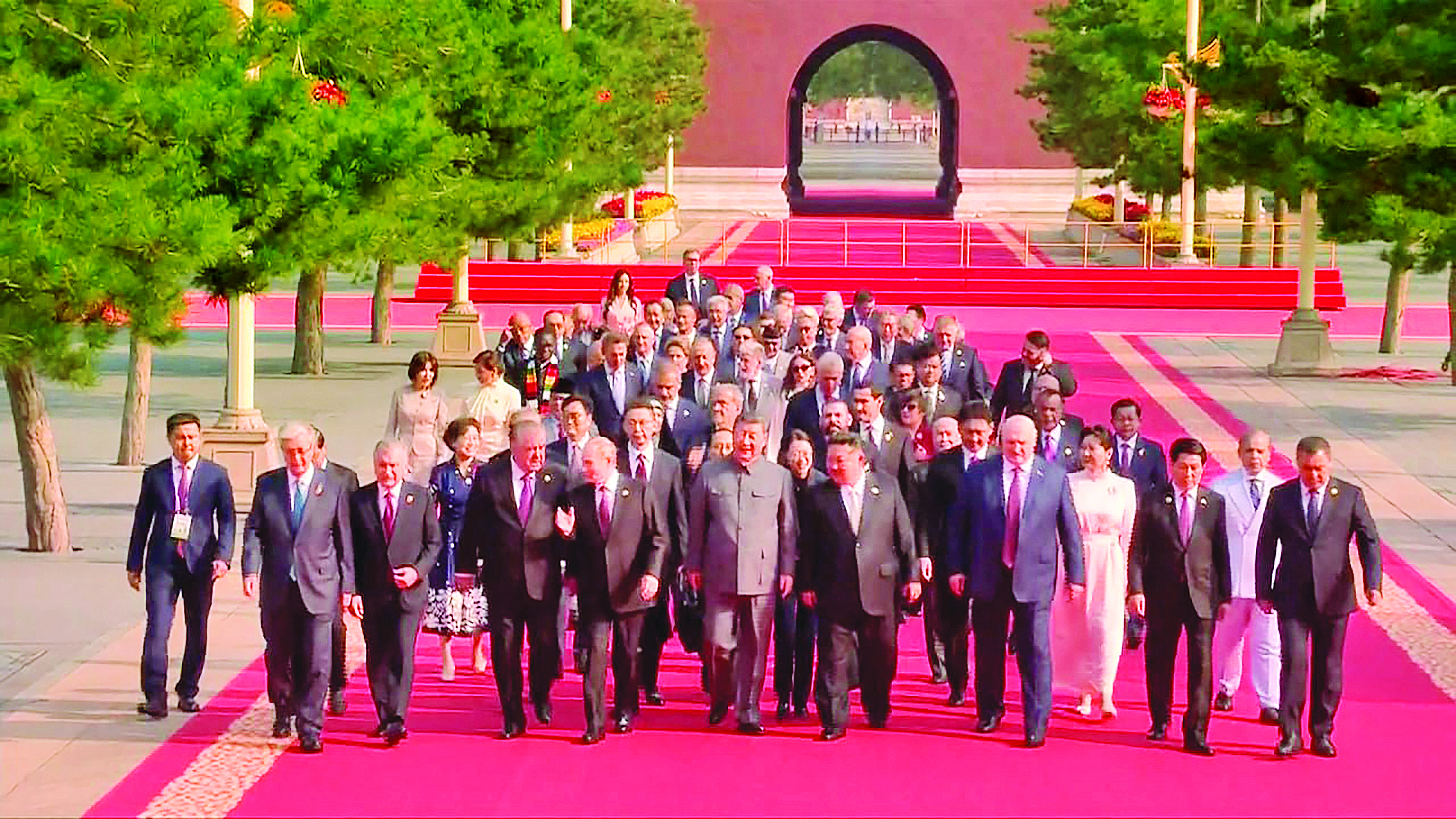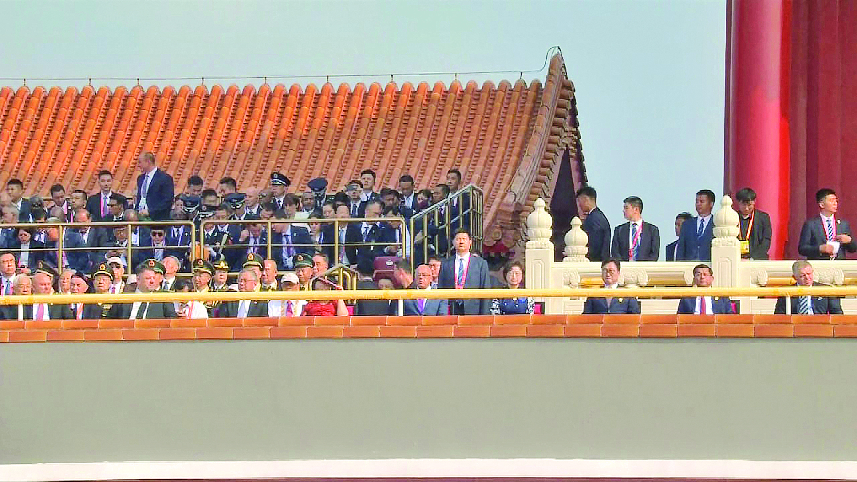 ယင်းနောက် ပြည်ထောင်စုသမ္မတမြန်မာနိုင်ငံတော်ယာယီသမ္မတ နိုင်ငံတော်လုံခြုံရေးနှင့်အေးချမ်းသာယာရေးကော်မရှင်ဥက္ကဋ္ဌနှင့် နိုင်ငံတကာမှ တက်ရောက်လာကြသည့် နိုင်ငံ့ခေါင်းဆောင်များသည် တရုတ်ပြည်သူ့သမ္မတနိုင်ငံ သမ္မတ ဦးဆောင်၍ စစ်ရေးပြအခမ်းအနား ကြည့်ရှုမည့် Tian'anmen Rostrum ရှုစင်သို့ တက်ရောက်နေရာယူကြသည်။