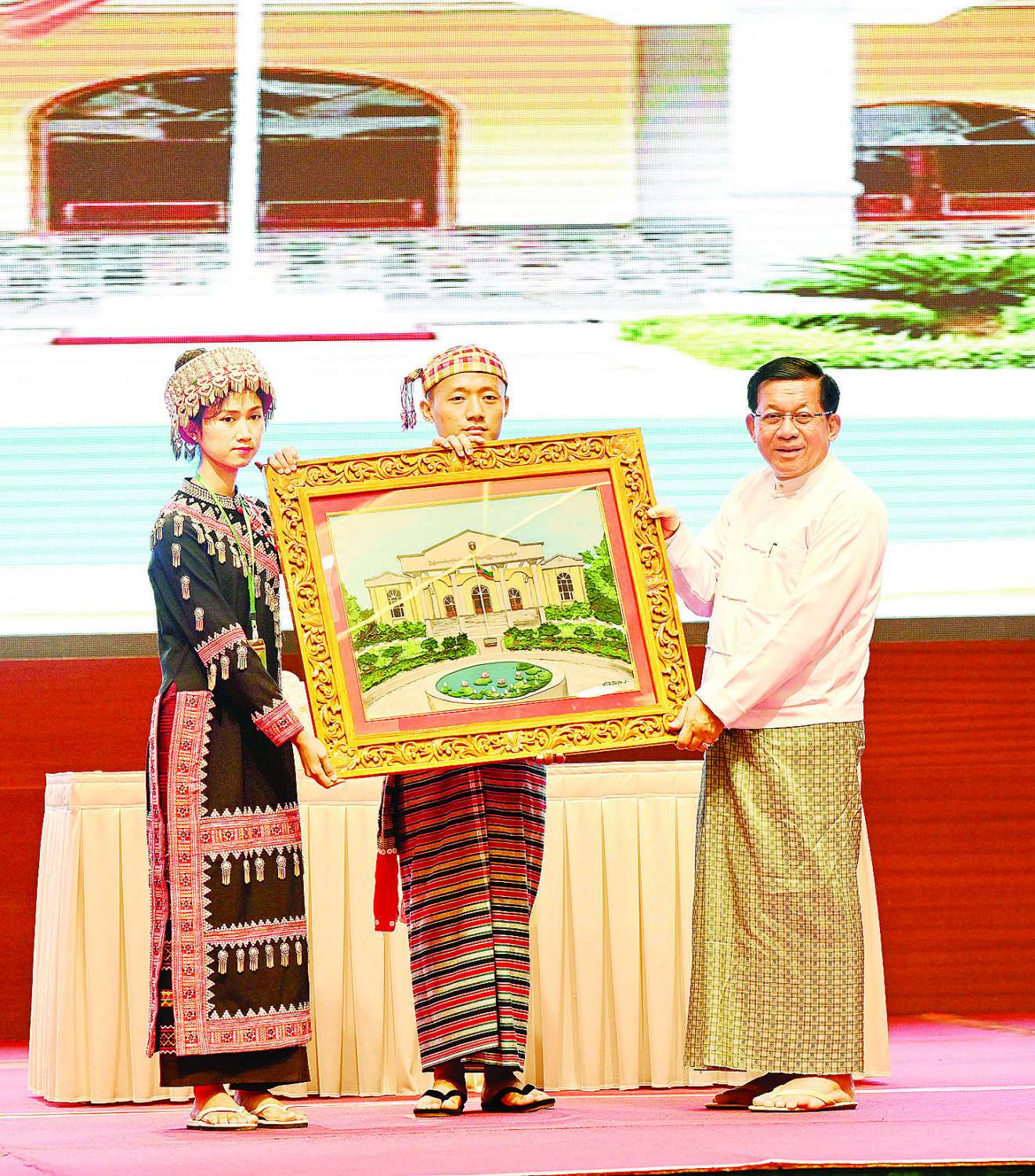 ယင်းနောက် နိုင်ငံတော်ယာယီသမ္မတ နိုင်ငံတော်လုံခြုံရေးနှင့်အေးချမ်းသာယာရေးကော်မရှင်ဥက္ကဋ္ဌထံ ကျောင်းသား၊ ကျောင်းသူ ၂ ဦးက အမှတ်တရ လက်ဆောင်ပစ္စည်းကို ဂါရဝပြုပေးအပ်သည်။