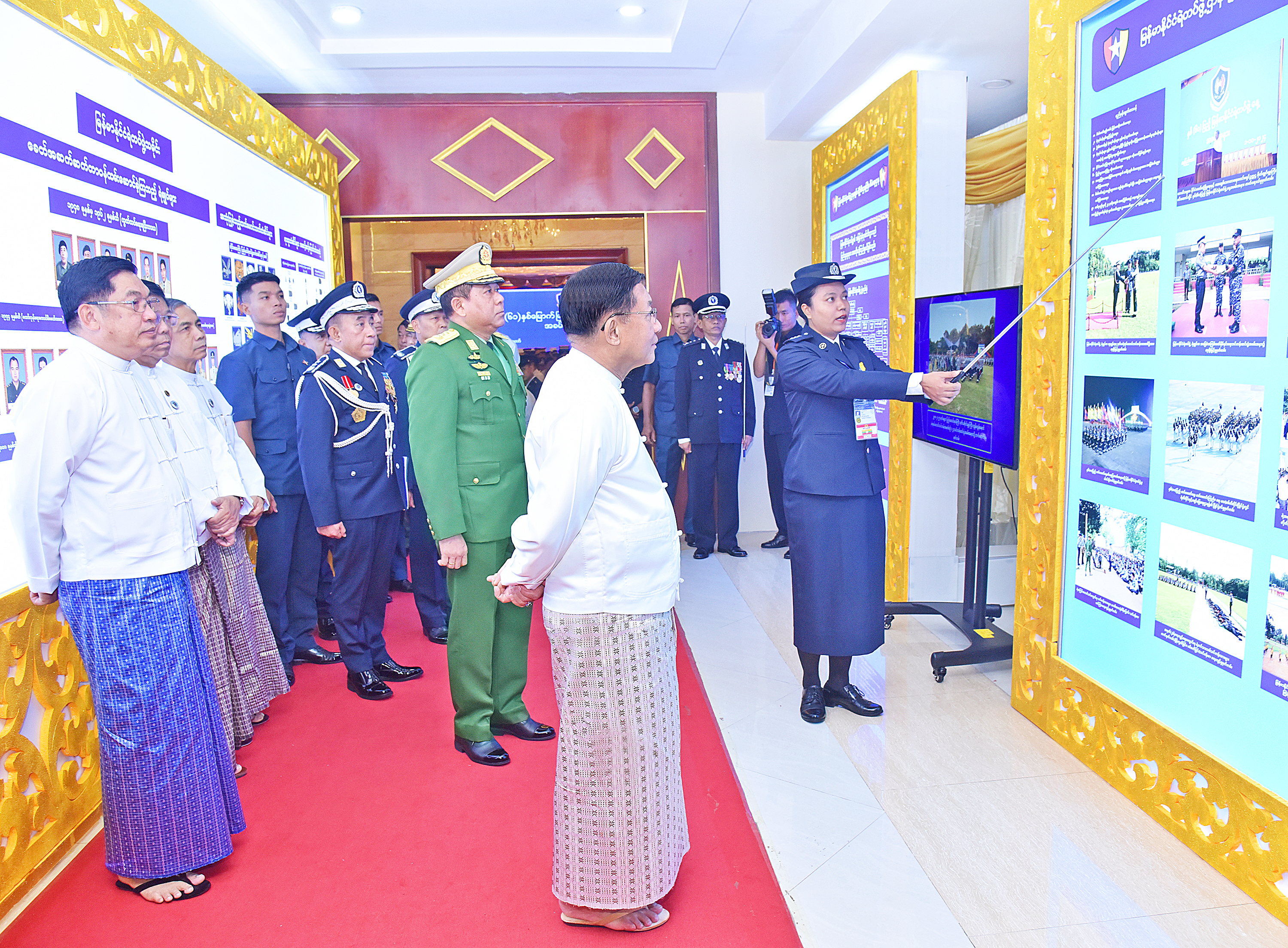 ယင်းနောက် (၆၁)နှစ်မြောက် မြန်မာနိုင်ငံရဲတပ်ဖွဲ့နေ့ အထိမ်းအမှတ် ခင်းကျင်းပြသထားသည့် မှတ်တမ်းဓာတ်ပုံများ၊ တပ်ဖွဲ့/ဌာနများတွင် အသုံးပြုလျက်ရှိသည့် စက်ကိရိယာများ၊ နည်းပညာဆိုင်ရာပစ္စည်းများ၊ လက်နက်များ၊ ဝတ်စုံများ၊ ဆက်သွယ်ရေးပစ္စည်းများ၊ ဖမ်းဆီးရမိသည့် မူးယစ်ဆေးဝါးများနှင့် ပြခန်းများအတွင်း စိတ်ပါဝင်စားစွာ လှည့်လည်ကြည့်ရှုခဲ့ကြောင်း သိရသည်။
