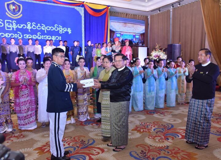 ပြည်ထောင်စုသမ္မတမြန်မာနိုင်ငံတော်ယာယီသမ္မတ နိုင်ငံတော်လုံခြုံရေးနှင့်အေးချမ်းသာယာရေးကော်မရှင်ဥက္ကဋ္ဌ ဗိုလ်ချုပ်မှူးကြီး မင်းအောင်လှိုင် (၆၁)နှစ်မြောက် မြန်မာနိုင်ငံရဲတပ်ဖွဲ့နေ့ အထိမ်းအမှတ် ဂုဏ်ပြုညစာစားပွဲ အခမ်းအနား တက်ရောက်