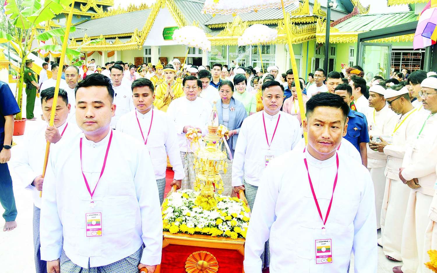 ဦးစွာ နိုင်ငံတော်စီမံအုပ်ချုပ်ရေးကောင်စီဥက္ကဋ္ဌ နိုင်ငံတော်ဝန်ကြီးချုပ်သည် ရွှေဘုန်းပွင့်စေတီတော်မြတ်ကြီး ဓမ္မာရုံတော်အတွင်းရှိ ဗုဒ္ဓရုပ်ပွားတော်မြတ်အား ဖူးမြော်ကြည်ညို၍ မြသပိတ်ဆွမ်းတော်၊ သစ်သီးပန်းမန်၊ သောက်တော်ရေချမ်းတို့ကို ဆက်ကပ်လှူဒါန်းသည်။