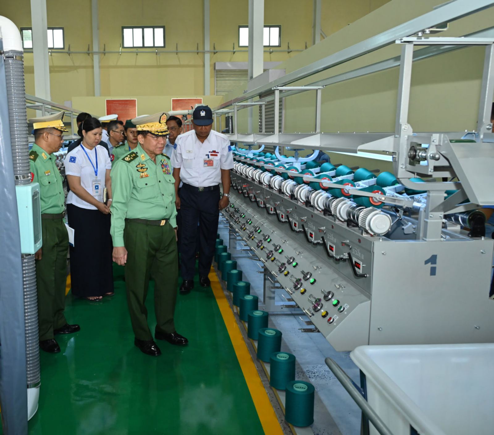 ယင်းနောက် နိုင်ငံတော်စီမံအုပ်ချုပ်ရေးကောင်စီဥက္ကဋ္ဌ တပ်မတော်ကာကွယ်ရေးဦးစီးချုပ်နှင့် အခမ်းအနားတက်ရောက်လာကြသူများသည် စက်ရုံအတွင်းရှိ ချည်ငင်အလုပ်ရုံ၊ ချည်ကျစ်အလုပ်ရုံနှင့် ချည်ဆေးဆိုးအလုပ်ရုံများအတွင်း ချည်များ အဆင့်ဆင့်ထုတ်လုပ်နေမှု အခြေအနေများကို လှည့်လည်ကြည့်ရှုစစ်ဆေးပြီး တာဝန်ရှိသူများ၏ တင်ပြချက်များအပေါ် လိုအပ်သည်များ လမ်းညွှန်မှာကြားသည်။