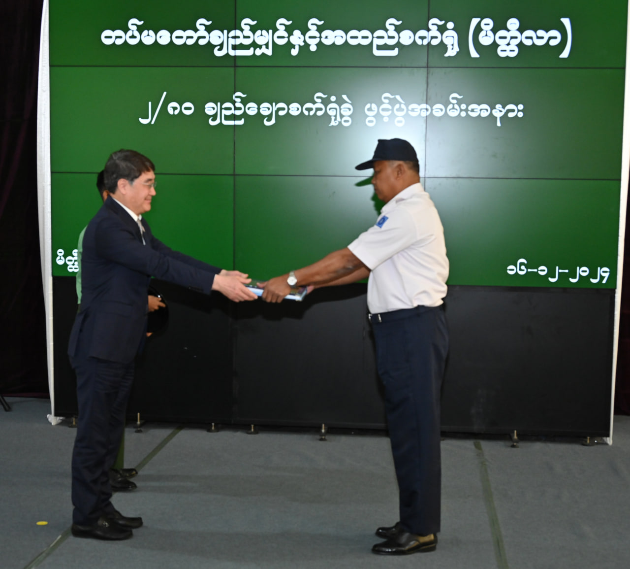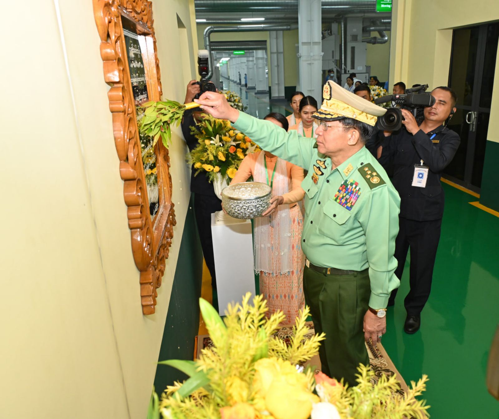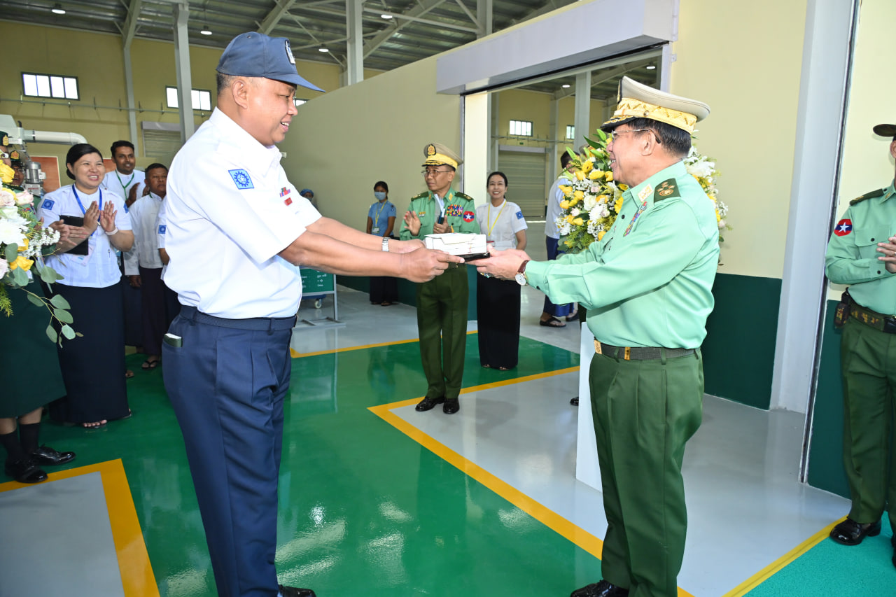 ထို့နောက် နိုင်ငံတော်စီမံအုပ်ချုပ်ရေးကောင်စီဥက္ကဋ္ဌ တပ်မတော်ကာကွယ်ရေးဦးစီးချုပ်က စက်ရုံဝန်ထမ်းများအတွက် ချီးမြှင့်ငွေများကို ပေးအပ်ရာ စက်ရုံမှတာဝန်ရှိသူတစ်ဦးက လက်ခံရယူသည်။