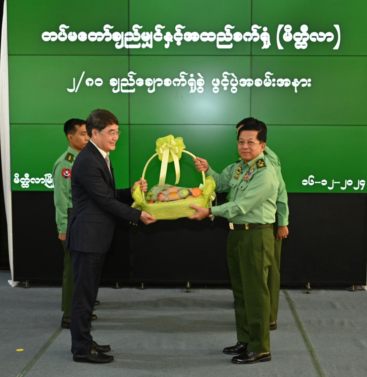 ထို့နောက် နိုင်ငံတော်စီမံအုပ်ချုပ်ရေးကောင်စီဥက္ကဋ္ဌ တပ်မတော်ကာကွယ်ရေးဦးစီးချုပ်က စက်ရုံတည်ဆောက်ရာတွင် ပါဝင်ခဲ့သည့် CTMTC ကုမ္ပဏီမှ တာဝန်ရှိသူတစ်ဦးအား သစ်သီးခြင်းနှင့် အမှတ်တရလက်ဆောင်ပေးအပ်ပြီး CTMTC ကုမ္ပဏီမှတာဝန်ရှိသူတစ်ဦးက နိုင်ငံတော်စီမံအုပ်ချုပ်ရေးကောင်စီဥက္ကဋ္ဌ တပ်မတော်ကာကွယ်ရေးဦးစီးချုပ်ထံ ဂါရဝပြုလက်ဆောင် ပြန်လည်ပေးအပ်သည်။