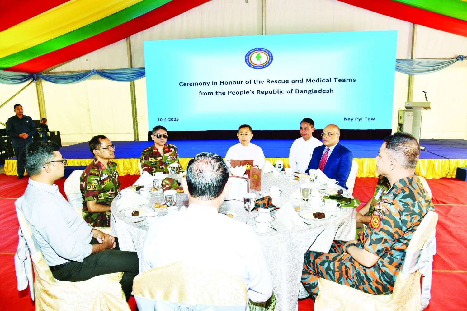 အခမ်းအနားအပြီးတွင် အမျိုးသားသဘာဝဘေးအန္တရာယ်ဆိုင်ရာ စီမံခန့်ခွဲမှုကော်မတီဥက္ကဋ္ဌ နိုင်ငံတော်စီမံအုပ်ချုပ်ရေးကောင်စီ ဒုတိယဥက္ကဋ္ဌ ဒုတိယဝန်ကြီးချုပ် ဒုတိယဗိုလ်ချုပ်မှူးကြီး စိုးဝင်းက ဘင်္ဂလားဒေ့ရှ်နိုင်ငံရှာဖွေကယ်ဆယ်ရေးနှင့် အရေးပေါ်ကျန်းမာရေးစောင့်ရှောက်မှုအဖွဲ့အား စားသောက်ဖွယ်ရာများဖြင့် တည်ခင်းဧည့်ခံပြီး ရင်းရင်းနှီးနှီးလိုက်လံနှုတ်ဆက်သည်။