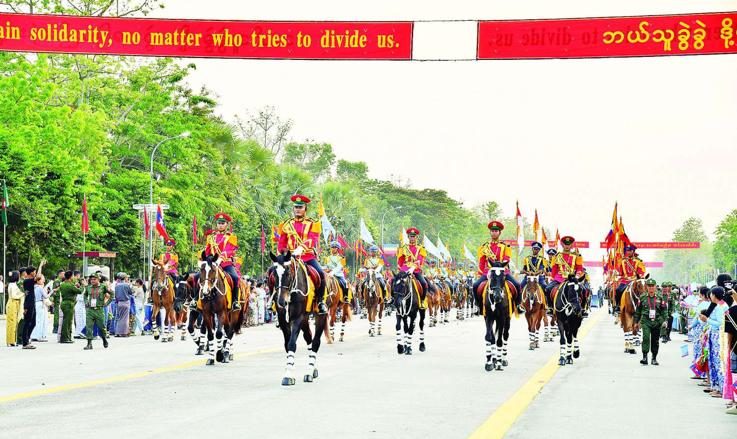 ယင်းနောက် နိုင်ငံတော်စီမံအုပ်ချုပ်ရေးကောင်စီဥက္ကဋ္ဌ တပ်မတော်ကာကွယ်ရေးဦးစီးချုပ် ဗိုလ်ချုပ်မှူးကြီး သတိုးမဟာသရေစည်သူ သတိုးသီရိသုဓမ္မ မင်းအောင်လှိုင်အား စစ်ရေးပြမှူးကြီး ဗိုလ်ချုပ် ရဲကျော်သူ ဦးဆောင်သော စစ်ကြောင်းကြီးများမှ တပ်မတော်သားများ၊ မြန်မာနိုင်ငံရဲတပ်ဖွဲ့ဝင်များက အစီအစဉ်အတိုင်း စစ်ကြောင်းပုံဖြင့် ညီညာစွာ ချီတက်အလေးပြုကြပြီး စစ်ရေးပြကွင်းကြီးအတွင်းမှ ပြန်လည်ထွက်ခွာကြသည်။