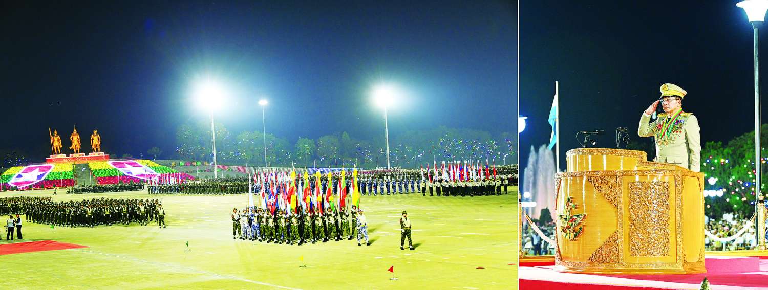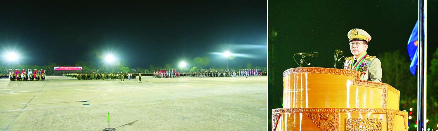 နှစ် (၈ဝ) ပြည့် တပ်မတော်နေ့ စစ်ရေးပြအခမ်းအနား ကျင်းပပြုလုပ်၊ နိုင်ငံတော်စီမံအုပ်ချုပ်ရေးကောင်စီဥက္ကဋ္ဌ တပ်မတော်ကာကွယ်ရေးဦးစီးချုပ် ဗိုလ်ချုပ်မှူးကြီး သတိုးမဟာသရေစည်သူ သတိုးသီရိသုဓမ္မ မင်းအောင်လှိုင် တက်ရောက်မိန့်ခွန်းပြောကြား