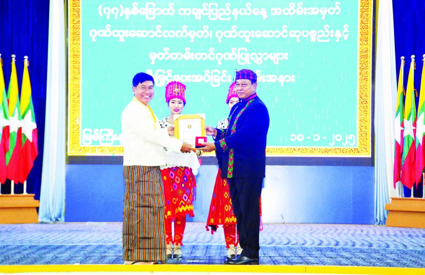 နိုင်ငံတော်စီမံအုပ်ချုပ်ရေးကောင်စီအဖွဲ့ဝင်၊ ဒုတိယဝန်ကြီးချုပ်နှင့် ပြည်ထောင်စုဝန်ကြီး ဗိုလ်ချုပ်ကြီးတင်အောင်စန်းနှင့် အဖွဲ့ဝင်များ (၇၇)နှစ်မြောက် ကချင်ပြည်နယ်နေ့အထိမ်းအမှတ် သဝဏ်လွှာဖတ်ပွဲ၊ ဂုဏ်ထူးဆောင်လက်မှတ်၊ ဂုဏ်ထူးဆောင်ဆုပစ္စည်းများနှင့် မှတ်တမ်းတင်ဂုဏ်ပြုလွှာချီးမြှင့်ပေးအပ်ခြင်းအခမ်းအနားသို့ တက်ရောက်