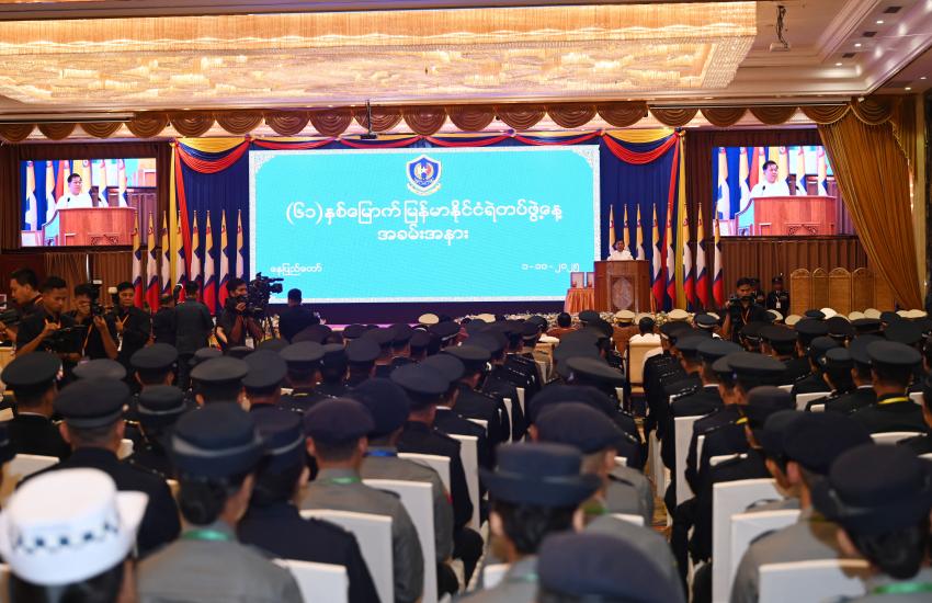 ပြည်ထောင်စုသမ္မတမြန်မာနိုင်ငံတော်ယာယီသမ္မတ နိုင်ငံတော်လုံခြုံရေးနှင့်အေးချမ်းသာယာရေးကော်မရှင်ဥက္ကဋ္ဌ ဗိုလ်ချုပ်မှူးကြီး မင်းအောင်လှိုင် (၆၁)နှစ်မြောက် မြန်မာနိုင်ငံရဲတပ်ဖွဲ့နေ့ အထိမ်းအမှတ် ဂုဏ်ပြုညစာစားပွဲ အခမ်းအနား တက်ရောက်