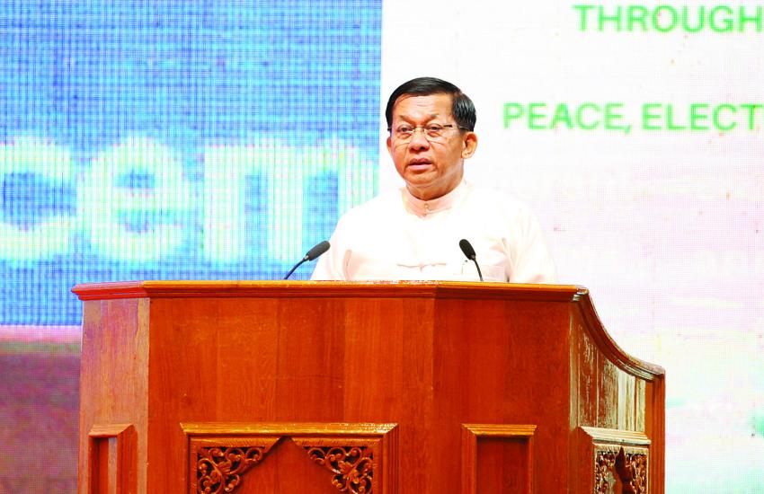 ငြိမ်းချမ်းရေးဖိုရမ် (Peace Forum 2025) ဖွင့်ပွဲအခမ်းအနားတွင် နိုင်ငံတော်စီမံအုပ်ချုပ်ရေးကောင်စီဥက္ကဋ္ဌ နိုင်ငံတော်ဝန်ကြီးချုပ် အမျိုးသားစည်းလုံးညီညွတ်ရေးနှင့် ငြိမ်းချမ်းရေးဖော်ဆောင်မှုဗဟိုကော်မတီဥက္ကဋ္ဌ ဗိုလ်ချုပ်မှူးကြီးမင်းအောင်လှိုင် ပြောကြားသည့်အဖွင့်မိန့်ခွန်း