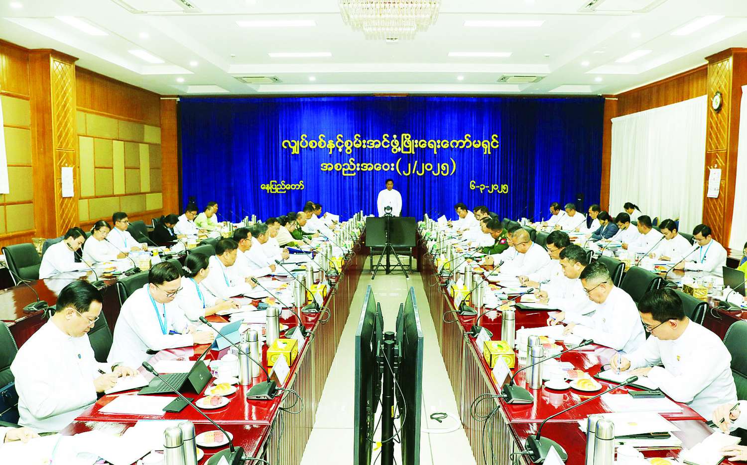 လျှပ်စစ်နှင့်စွမ်းအင်ဖွံ့ဖြိုးရေးကော်မရှင်၏ (၂/၂၀၂၅)အစည်းအဝေးကို ယနေ့မွန်းလွဲပိုင်းတွင်နေပြည်တော်ရှိ နိုင်ငံတော်စီမံအုပ်ချုပ်ရေးကောင်စီရုံး အစည်းအဝေးခန်းမ၌ ကျင်းပရာ လျှပ်စစ်နှင့်စွမ်းအင်ဖွံ့ဖြိုးရေးကော်မရှင်ဥက္ကဋ္ဌ နိုင်ငံတော်စီမံအုပ်ချုပ်ရေးကောင်စီအဖွဲ့ဝင် ဒုတိယဝန်ကြီးချုပ်နှင့် နိုင်ငံတော်ဝန်ကြီးချုပ်ရုံး ပြည်ထောင်စုဝန်ကြီး ဗိုလ်ချုပ်ကြီးတင်အောင်စန်း၊ ကော်မရှင်ဒုတိယဥက္ကဋ္ဌ(၁)နှင့် ကော်မရှင်အဖွဲ့ဝင်များ၊ နေပြည်တော်ကောင်စီအဖွဲ့ဝင်၊ သီးခြားဖိတ်ကြားထားသည့် ပုဂ္ဂိုလ်များနှင့် တာဝန်ရှိသူများတက်ရောက်ကြပြီး တိုင်းဒေသကြီး၊ ပြည်နယ်ဝန်ကြီးချုပ်များက အွန်လိုင်းစနစ်ဖြင့် တက်ရောက်ကြသည်။