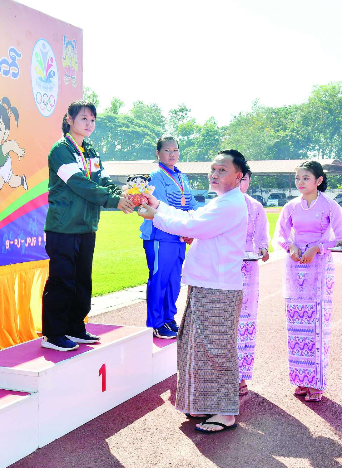 ဆက်လက်၍ နိုင်ငံတော်စီမံအုပ်ချုပ်ရေးကောင်စီအဖွဲ့ဝင် ဦးရွှေကြိမ်းက အမျိုးသမီးသံလုံးပစ် F 44/62/63/64 ပြိုင်ပွဲတွင် ပထမဆုရရှိသည့် မွန်ပြည်နယ်၊ ဒုတိယဆုရရှိသည့် ပြည်ထောင်စုနယ်မြေ နေပြည်တော်နှင့် တတိယဆုရရှိသည့် ပဲခူးတိုင်းဒေသကြီးအသင်းတို့မှ ပြိုင်ပွဲဝင်များကိုလည်းကောင်း၊ အမျိုးသမီးမီတာ (၂၀၀) T44/64 အပြေးပြိုင်ပွဲတွင် ပထမဆုရရှိသည့် ဧရာဝတီတိုင်းဒေသကြီး၊ ဒုတိယဆုရရှိသည့် မွန်ပြည်နယ်နှင့် တတိယဆုရရှိသည့် ဧရာဝတီတိုင်းဒေသကြီးအသင်းတို့မှ ပြိုင်ပွဲဝင်များကိုလည်းကောင်း ဂုဏ်ပြုဆုတံဆိပ်နှင့် အမျိုးသားအားကစားပွဲတော် အထိမ်းအမှတ်အရုပ်အား ပေးအပ်ချီးမြှင့်သည်။