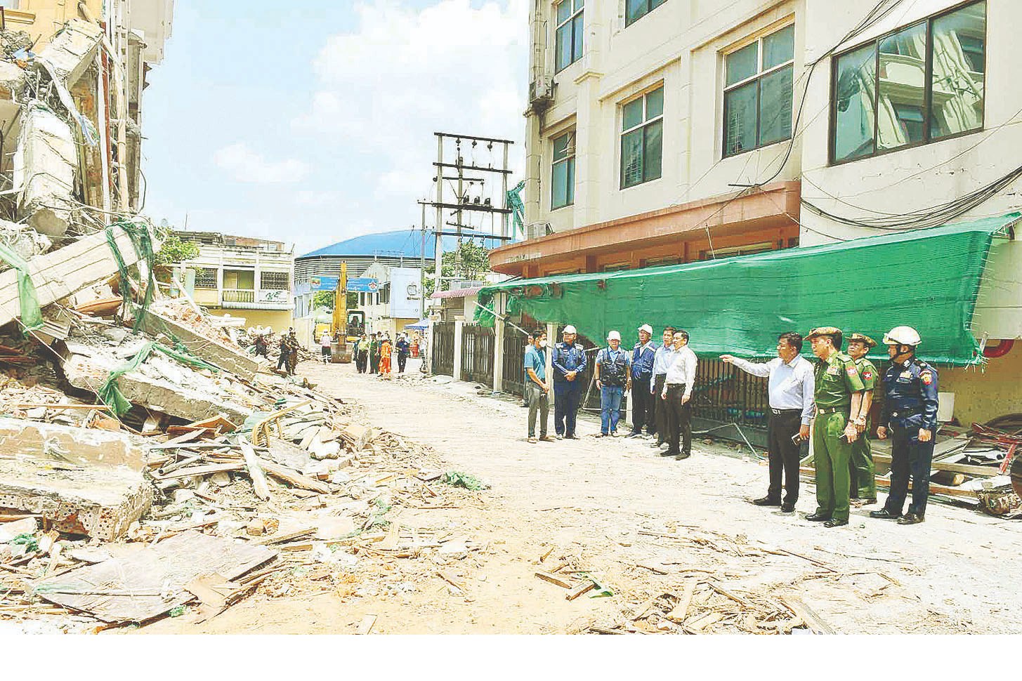 ထို့နောက် ချမ်းအေးသာစံမြို့နယ်ရှိ Golden City Hotel နေရာ၌ အပျက်အစီးများ ဖယ်ရှားရှင်းလင်းနေမှုအားလည်းကောင်း၊ ချမ်းအေးသာစံမြို့နယ်ရှိ အမှတ် (၄) ရေစစ်ကန်၌ ရေပေးဝေရေးလုပ်ငန်းဆောင်ရွက်နေမှုများအားလည်းကောင်း၊ Sky Villa နေရာတွင် အဆောက်အအုံအပျက်အစီးများ ဖယ်ရှားရှင်းလင်းနေမှုများအားလည်းကောင်း သွားရောက်ကြည့်ရှုစစ်ဆေးပြီး လိုအပ်သည်များကို တာဝန်ရှိသူများနှင့် ညှိနှိုင်းပေါင်းစပ်ဆောင်ရွက်ပေးသည်။