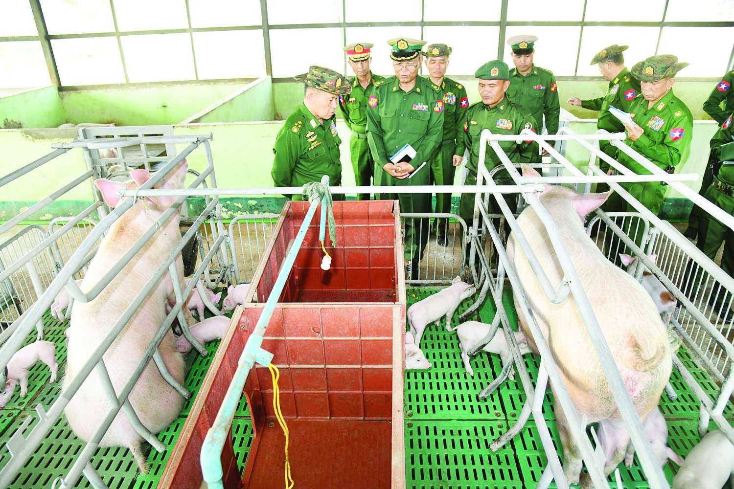 ထို့နောက် နိုင်ငံတော်စီမံအုပ်ချုပ်ရေးကောင်စီ ဒုတိယဥက္ကဋ္ဌ ဒုတိယတပ်မတော်ကာကွယ်ရေးဦးစီးချုပ် ကာကွယ်ရေးဦးစီးချုပ် (ကြည်း)နှင့် အဖွဲ့များသည် မွေးမြူရေးခြံများအတွင်း ဥစားကြက်များ မွေးမြူထားရှိမှုများကိုလည်းကောင်း၊ နွား မေထုန်မဲ့ သားစပ်ခြင်း ပြုလုပ်ရန်အတွက် သားစပ်ကိရိယာများ ခင်းကျင်းပြသထားရှိမှုကိုလည်းကောင်း၊ ဝက်မွေးမြူရေးခြံများကိုလည်းကောင်း လိုက်လံကြည့်ရှုစစ်ဆေးရာ တာဝန်ရှိသူများက ရှင်းလင်းတင်ပြကြသည်။