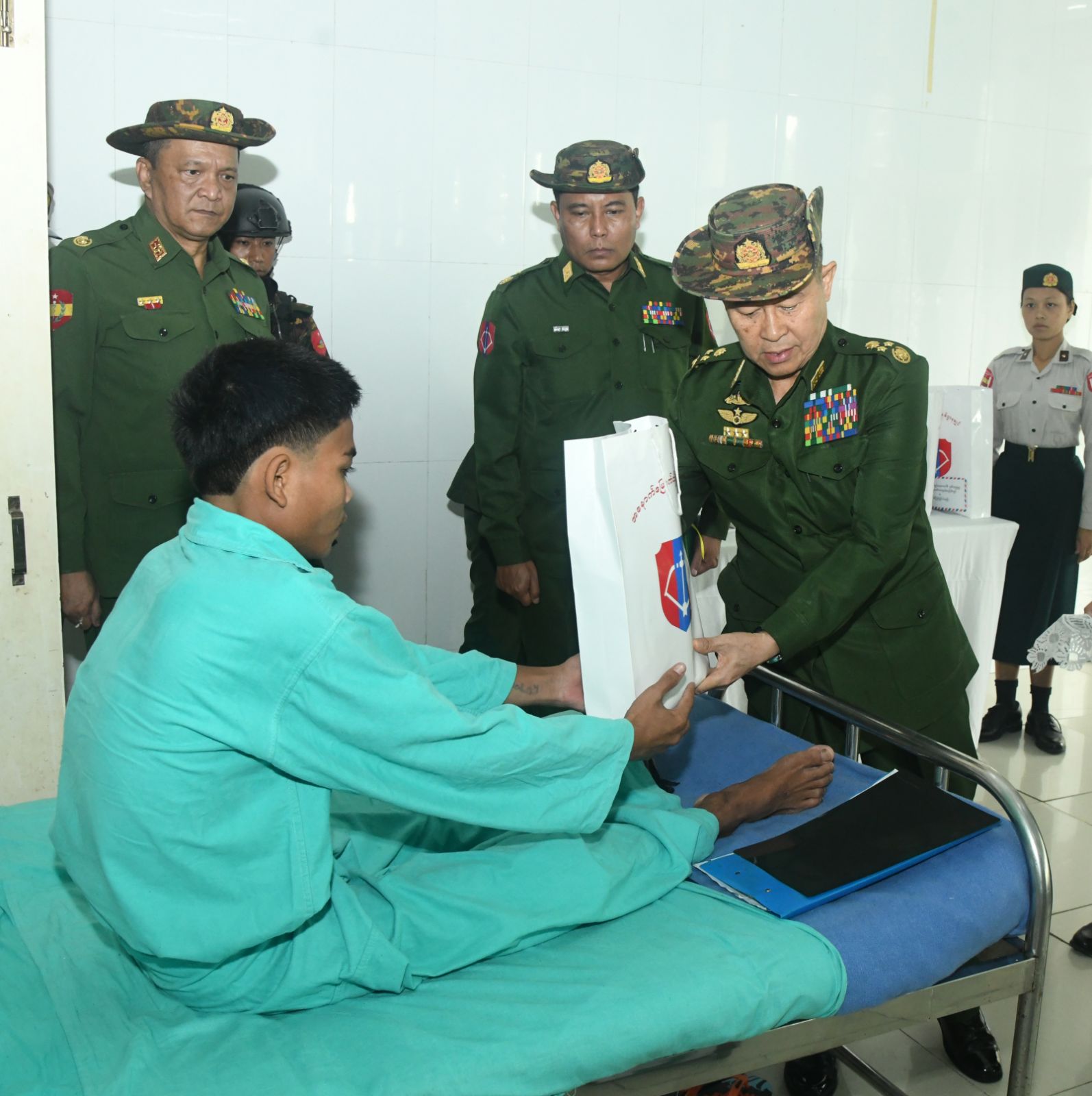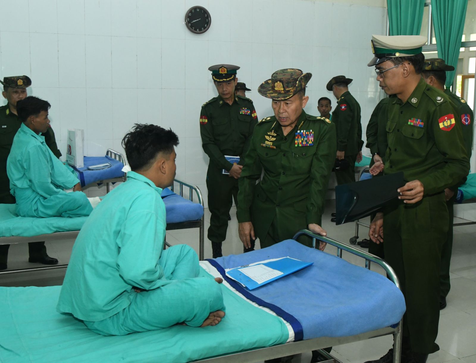 ထို့နောက် နိုင်ငံတော်စီမံအုပ်ချုပ်ရေးကောင်စီဒုတိယဥက္ကဋ္ဌ ဒုတိယတပ်မတော်ကာကွယ်ရေးဦးစီးချုပ်၊ ကာကွယ်ရေးဦးစီးချုပ်(ကြည်း)နှင့် အဖွဲ့ဝင်များသည် မုံရွာမြို့ရှိ နယ်မြေခံတပ်မတော်ဆေးရုံတွင် တက်ရောက်ဆေးကုသမှု ခံယူလျက်ရှိသည့် နိုင်ငံတော်ကာကွယ်ရေးနှင့် လုံခြုံရေးတာဝန်များထမ်းဆောင်စဉ် ထိခိုက်ဒဏ်ရာရရှိခဲ့သော အရာရှိ၊ စစ်သည်များ၊ မြန်မာနိုင်ငံရဲတပ်ဖွဲ့ဝင်များ၊ ပြည်သူစစ်(ဌာနေ)တပ်ဖွဲ့ဝင်များအား တစ်ဦးချင်းလိုက်လံတွေ့ဆုံ၍ ထိခိုက်ဒဏ်ရာရရှိခဲ့မှု အခြေအနေများ၊ ဆေးဝါးကုသမှုပေးထားသည့် အခြေအနေများ၊ ရောဂါကုသပျောက်ကင်းသက်သာမှု အခြေအနေများနှင့် ကျန်းမာရေးတိုးတက်ကောင်းမွန်မှုအခြေအနေများကို ရင်းရင်းနှီးနှီးမေးမြန်းကာ အားပေးစကားပြောကြားပြီး တင်ပြချက်များအပေါ် လိုအပ်သည်များ ပေါင်းစပ်ညှိနှိုင်းဖြည့်ဆည်းဆောင်ရွက်ပေးကာ ထောက်ပံ့ပစ္စည်းများနှင့် ဂုဏ်ပြုချီးမြှင့်ငွေများ ပေးအပ်သည်။