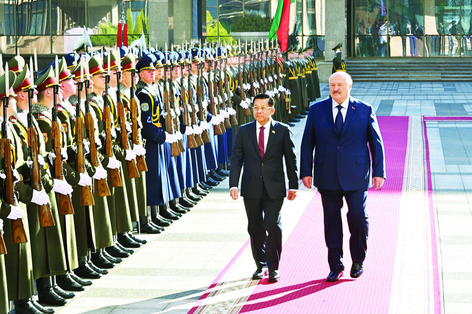 နိုင်ငံတော်စီမံအုပ်ချုပ်ရေးကောင်စီဥက္ကဋ္ဌ နိုင်ငံတော်ဝန်ကြီးချုပ် ဗိုလ်ချုပ်မှူးကြီး မင်းအောင်လှိုင်အား ဘယ်လာရုစ်သမ္မတနိုင်ငံသမ္မတ H.E. Mr. Alexander Gregoryevich Lukashenko က ဂုဏ်ပြုကြိုဆို တွေ့ဆုံဆွေးနွေး