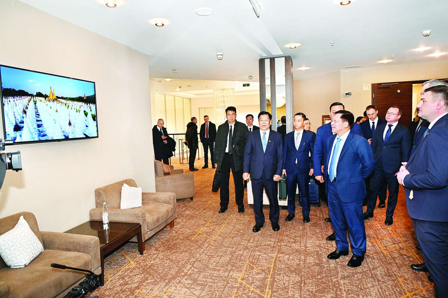 ရုရှားဖက်ဒရေးရှင်းနိုင်ငံ နိုဗိုစီဗစ်မြို့၊ ကောင်စစ်ဝန်ချုပ်ရုံးဖွင့်ပွဲ အခမ်းအနားကို ယနေ့ဒေသစံတော်ချိန် နံနက်ပိုင်းတွင် Grand Autograph ဟိုတယ်၌ ကျင်းပပြုလုပ်ရာ ရုရှားနိုင်ငံသို့ တရားဝင်ချစ်ကြည်ရေးခရီး ရောက်ရှိနေသည့် နိုင်ငံတော်စီမံအုပ်ချုပ်ရေးကောင်စီဥက္ကဋ္ဌ နိုင်ငံတော်ဝန်ကြီးချုပ် ဗိုလ်ချုပ်မှူးကြီး မင်းအောင်လှိုင် တက်ရောက်ဖွင့်လှစ်ပေးသည်။