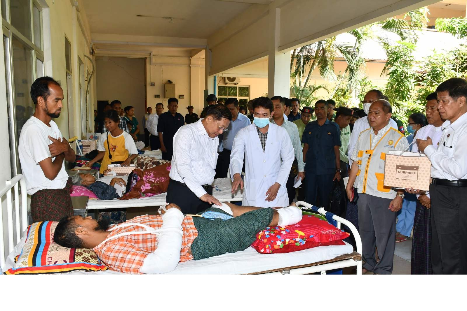 ဦးစွာ နိုင်ငံတော်စီမံအုပ်ချုပ်ရေးကောင်စီဥက္ကဋ္ဌ နိုင်ငံတော်ဝန်ကြီးချုပ်နှင့် အဖွဲ့ဝင်များသည် ကျောက်ဆည်မြို့ ပြည်သူ့ဆေးရုံကြီးသို့ရောက်ရှိကြပြီး ငလျင်ဘေးဒဏ်ကြောင့် ထိခိုက်ဒဏ်ရာရရှိခဲ့သူများအား ဆေးဝါးကုသမှုဆောင်ရွက်ပေးနေမှုများနှင် လူနာများအား လိုအပ်သည့်ကျန်းမာရေးစောင့်ရှောက်မှု ဆောင်ရွက်ပေးထားမှုများကို ကြည့်ရှု၍ အားပေးစကားပြောကြားကာ ထိခိုက်ဒဏ်ရာရရှိသူများအတွက် ထောက်ပံ့ငွေများနှင့် စားသောက်ဖွယ်ရာများ ပေးအပ်သည်။