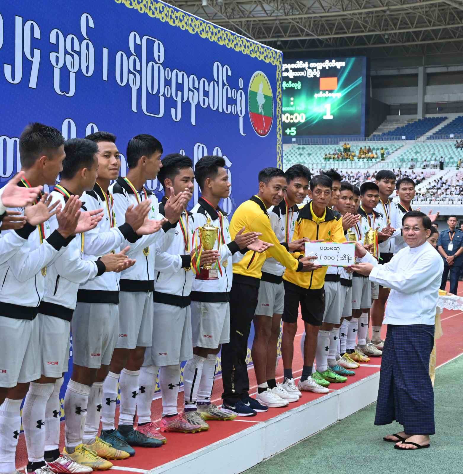 နိုင်ငံတော်စီမံအုပ်ချုပ်ရေးကောင်စီဥက္ကဋ္ဌ နိုင်ငံတော်ဝန်ကြီးချုပ် ဗိုလ်ချုပ်မှူးကြီး မင်းအောင်လှိုင် ၂ဝ၂၄ ခုနှစ်၊ ဝန်ကြီးဌာနပေါင်းစုံတက္ကသိုလ်များ ဘောလုံးပြိုင်ပွဲ ဗိုလ်လုပွဲသို့ တက်ရောက်ကြည့်ရှုအားပေးပြီး ဆုများပေးအပ်ချီးမြှင့်