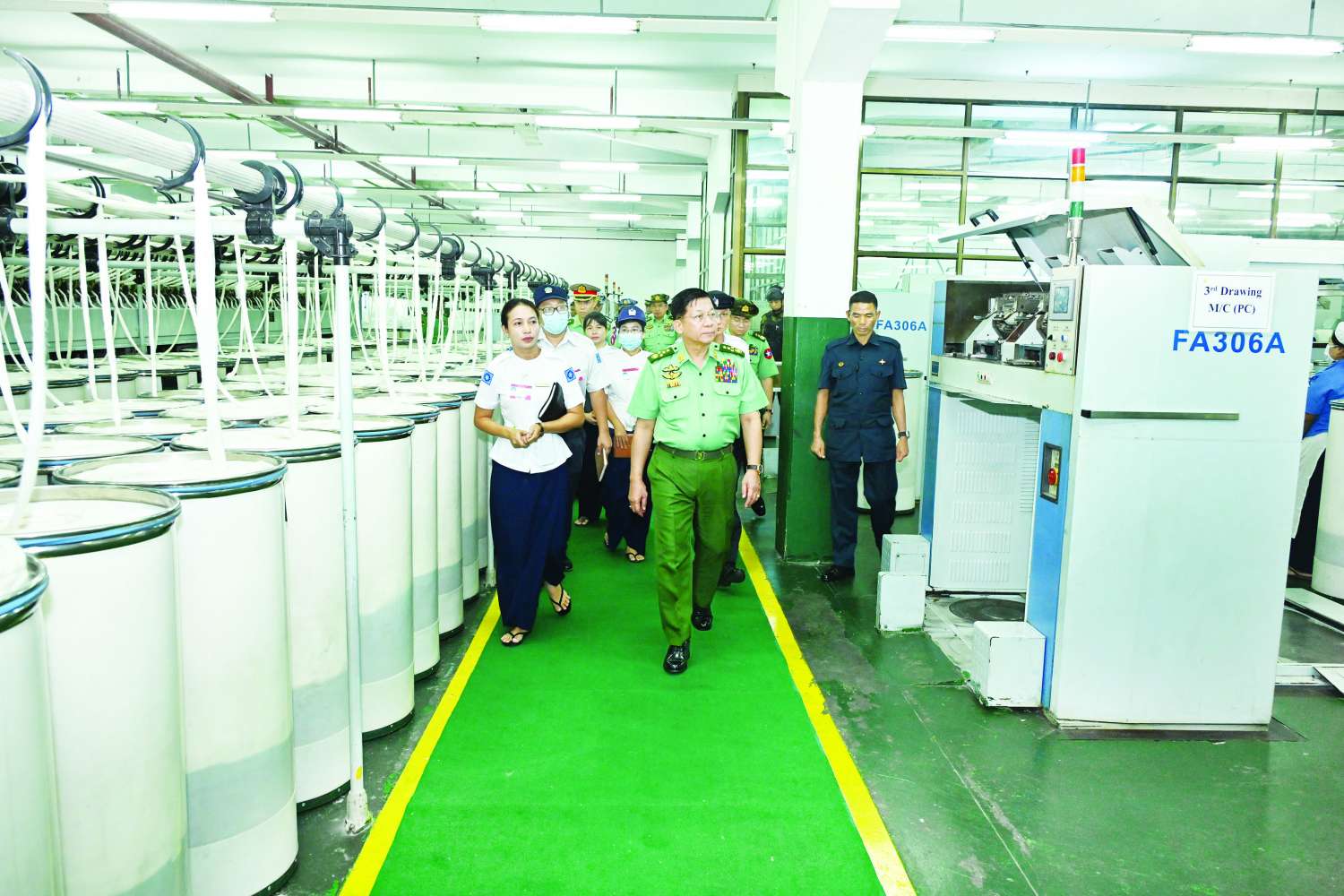 ထို့နောက် နိုင်ငံတော်စီမံအုပ်ချုပ်ရေးကောင်စီဥက္ကဋ္ဌ တပ်မတော်ကာကွယ်ရေးဦးစီးချုပ်နှင့် အဖွဲ့ဝင်များသည် စက်ရုံအတွင်း ချည်မျှင်နှင့်အထည်များအား အဆင့်ဆင့်ထုတ်လုပ်နေမှု အခြေအနေများအား လှည့်လည်ကြည့်ရှုစစ်ဆေးပြီး စက်ရုံမှူးနှင့် တာဝန်ရှိသူများ၏ တင်ပြချက်များအပေါ် လိုအပ်သည်များ ညှိနှိုင်းဖြည့်ဆည်းဆောင်ရွက်ပေးကာ စက်ရုံဝန်ထမ်းများအတွက် ချီးမြှင့်ငွေများပေးအပ်သည်။