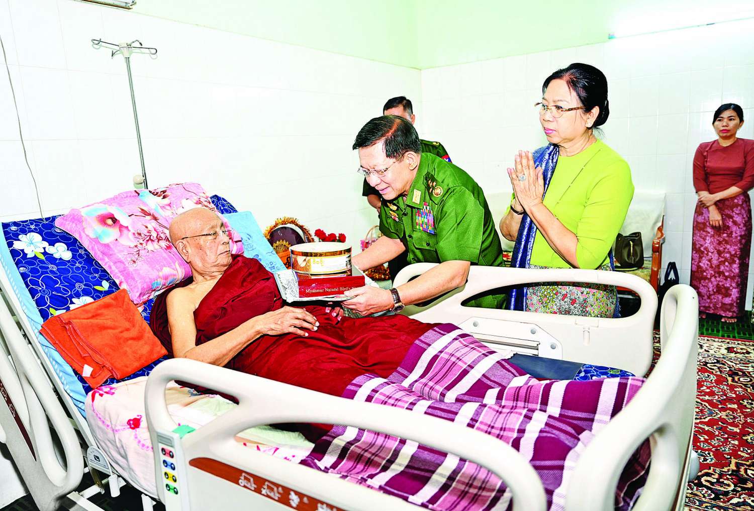 ဆက်လက်၍ နိုင်ငံတော်စီမံအုပ်ချုပ်ရေးကောင်စီဥက္ကဋ္ဌ တပ်မတော်ကာကွယ်ရေးဦးစီးချုပ်နှင့်ဇနီး၊ အဖွဲ့ဝင်များသည် ဆေးရုံတက်ရောက်ကုသမှုခံယူလျက်ရှိသည့် အရာရှိ၊ စစ်သည်များ၊ မြန်မာနိုင်ငံရဲတပ်ဖွဲ့ဝင်များနှင့် ပြည်သူ့စစ်ဌာနေတပ်ဖွဲ့ဝင်များအား ဂုဏ်ပြုချီးမြှင့်ငွေနှင့် လက်ဆောင်ပစ္စည်းများ ပေးအပ်သည်။