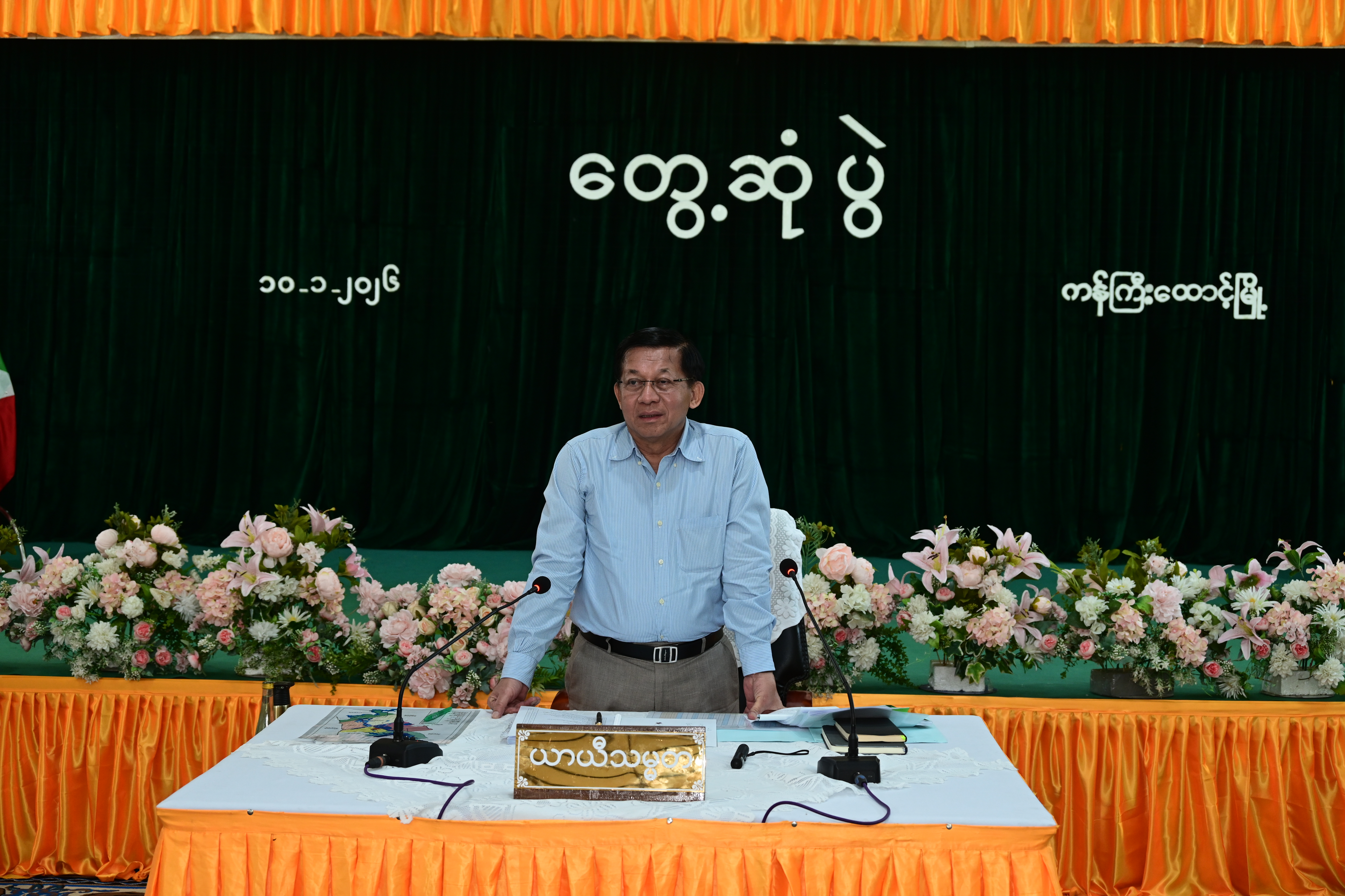 ထို့နောက် နိုင်ငံတော်ယာယီသမ္မတ နိုင်ငံတော်လုံခြုံရေးနှင့်အေးချမ်းသာယာရေးကော်မရှင်ဥက္ကဋ္ဌက ကန်ကြီးထောင့်ဒေသသို့ မိမိအနေဖြင့် ပထမဆုံးရောက်ရှိခြင်းဖြစ်ကြောင်း၊ မြို့အနေဖြင့် သန့်ရှင်းသပ်ရပ်စွာဖြင့် မြင်တွေ့ရသည့်အတွက် ဝမ်းမြောက်ကြောင်း၊ အစိုးရတစ်ရပ်၏တာဝန်သည် နိုင်ငံဖွံ့ဖြိုးတိုးတက်ရေးကို ဆောင်ရွက်ရခြင်းဖြစ်ကြောင်း၊ မိမိတို့အနေဖြင့် ခေတ္တတာဝန်ယူဆောင်ရွက်ရသည့် အစိုးရအဖွဲ့ဖြစ်ကြောင်း၊ ၂၀၂၀ ပြည့်နှစ် ပါတီစုံဒီမိုကရေစီအထွေထွေရွေးကောက်ပွဲတွင် မဲမသမာမှုများ ဖြစ်ပွားခဲ့ခြင်းကြောင့် မိမိတို့အနေဖြင့် နိုင်ငံတော်တာဝန်များကို ဖွဲ့စည်းပုံအခြေခံဥပဒေ (၂၀၀၈ ခုနှစ်) နှင့်အညီ ထမ်းဆောင်ခဲ့ရခြင်းဖြစ်ကြောင်း၊ မဲမသမာမှုများဖြစ်ပေါ်ခဲ့မှုနှင့်ပတ်သက်၍လည်း မိမိတို့အနေဖြင့် စစ်ဆေးဖော်ထုတ်တွေ့ရှိခဲ့ရကြောင်း၊ မိမိတို့အစိုးရအဖွဲ့ စတင်တာဝန်ထမ်းဆောင်ချိန်တွင် ကိုဗစ် - ၁၉ ရောဂါဖြစ်ပွားလျက်ရှိသည့်အချိန်ဖြစ်ပြီး နိုင်ငံရေးအရ သဘောထားမတိုက်ဆိုင်မှုများကြောင့် ပဋိပက္ခများ ဖြစ်ပေါ်ခဲ့ကြောင်း၊ ထိုကဲ့သို့ ဆူပူအကြမ်းဖက်မှုများ၊ ကိုဗစ်-၁၉ ရောဂါဖြစ်ပေါ်နေမှုများနှင့်ကြုံတွေ့နေရသည့်အချိန်တွင် နိုင်ငံရေးနှင့် နိုင်ငံ့အရေးကို ကွဲပြားစွာသိမြင်မှုမရှိဘဲ ဘေးပယောဂများ၊ လှုံ့ဆော်သွေးထိုးမှုများ၊ ခြိမ်းခြောက်အကျပ်ကိုင်မှုများကြောင့် ပညာရေးနှင့်ကျန်းမာရေးဝန်ထမ်းများအပါအဝင် နိုင်ငံ့ဝန်ထမ်းများ လုပ်ငန်းခွင်စွန့်ခွာမှု DCS လုပ်ဆောင်မှုများကြောင့် အခက်အခဲ၊ အကျပ်အတည်းများကို ကျော်လွှားခဲ့ရကြောင်း။