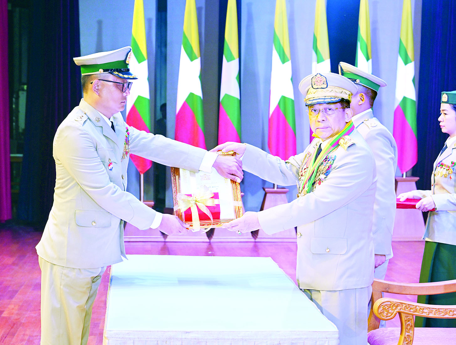 တပ်မတော်စွမ်းရည်သတ္တိဆိုင်ရာ ဂုဏ်ထူးဆောင်တံဆိပ်များ ချီးမြှင့်အပ်နှင်းခြင်း အခမ်းအနားကို ယနေ့မွန်းလွဲပိုင်းတွင် နေပြည်တော်ရှိ ဇေယျာသီရိဗိမာန်၌ ကျင်းပပြုလုပ်ရာ နိုင်ငံတော်စီမံအုပ်ချုပ်ရေးကောင်စီဥက္ကဋ္ဌ တပ်မတော်ကာကွယ်ရေးဦးစီးချုပ် ဗိုလ်ချုပ်မှူးကြီး သတိုးမဟာသရေစည်သူ သတိုးသီရိသုဓမ္မ မင်းအောင်လှိုင် တက်ရောက်မိန့်ခွန်းပြောကြားပြီး ဂုဏ်ထူးဆောင်တံဆိပ်များကို ချီးမြှင့်အပ်နှင်းပေးသည်။